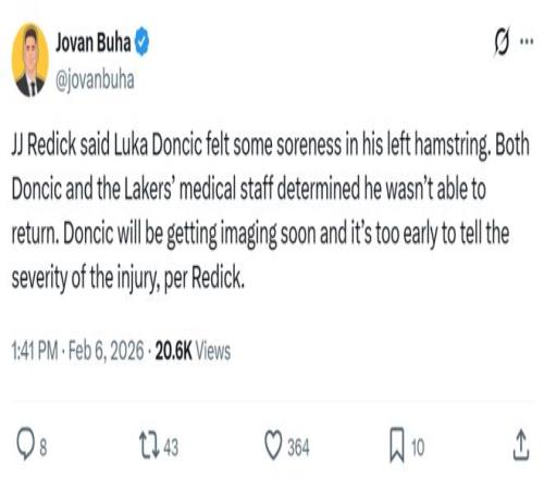 湖人官方也在半場(chǎng)結(jié)束時(shí)確認(rèn)消息真實(shí)性,指出東契奇因腿筋酸痛本場(chǎng)將不會(huì)回歸,確定缺席下半場(chǎng)的爭奪。