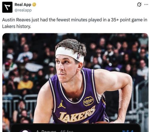 憑借這樣的表現(xiàn),里夫斯成為湖人隊(duì)史單場(chǎng)拿下35+得分用時(shí)最少的球員。