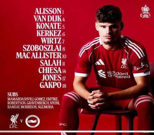 利物浦首發(fā):1-阿利松、8-索博斯洛伊、4-范戴克、5-科納特、6-凱爾凱茲、17-柯蒂斯-瓊斯、7-維爾茨、10-麥卡利斯特、11-薩拉赫、14-費(fèi)代里科-基耶薩、18-加克波