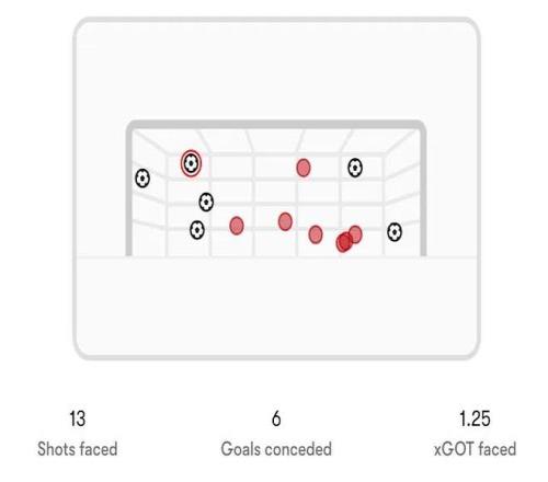 這并非偶然。本賽季英超,阿森納門將總共面對13次禁區(qū)外的射門,其中6次轉(zhuǎn)化成了進球。按照Opta的預期進球模型,根據(jù)射門角度、速度和門將位置,拉亞本應只丟1到2球,但他實際丟了6個。
