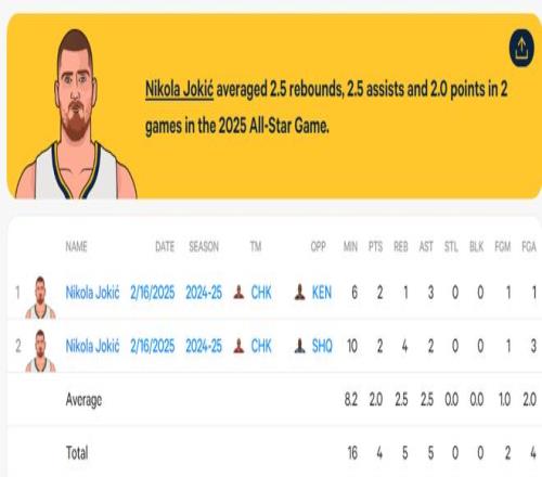 數(shù)據(jù)媒體StatMuse曬出了約基奇最近兩年全明星的數(shù)據(jù),今年是5分鐘,1中0拿0分2籃板0助攻。