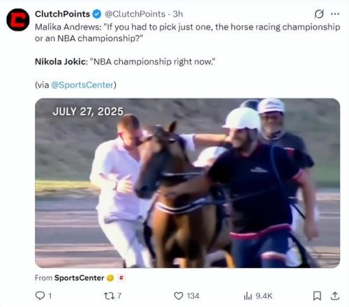記者還詢(xún)問(wèn)約基奇,如果是你的賽馬冠軍與NBA冠軍你選擇哪一個(gè)?約基奇表示:如果是現(xiàn)在的話(huà)選NBA總冠軍。(此前約基奇在自己的馬奪冠后流淚,他談到詹姆斯退役后自己不僅不會(huì)哭,連傷感都不會(huì)有)