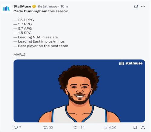 數(shù)據(jù)媒體曬出坎寧安本賽季場(chǎng)均25.7分5.7籃板9.7助攻1.5搶斷,他的助攻領(lǐng)跑聯(lián)盟,正負(fù)值領(lǐng)先東部,他是球隊(duì)最出色的球員,力挺他拿MVP。