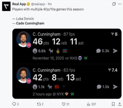 3.賽季有多場(chǎng)40+10助攻的球員只有東契奇、坎寧安;
