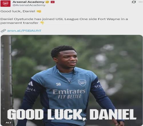 官方:阿森納宣布丹尼爾-奧耶通德轉(zhuǎn)會(huì)加盟了USL League One(美國(guó)職業(yè)足球的低級(jí)別聯(lián)賽)的Fort Wayne俱樂(lè)部。